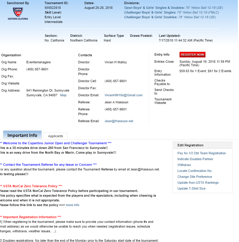 The tournament director normally puts all important information for the parents and the players to read here. It is important that you read this section before registering.