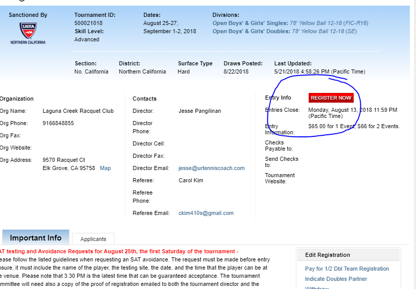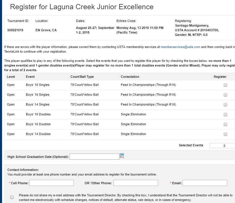 Be sure that you are selecting the correct age division and level. Some Tournaments have multiple events and it can be easy to pick the wrong level. Be sure to enter your contact information just in case there are any changes and the director needs to contact you.